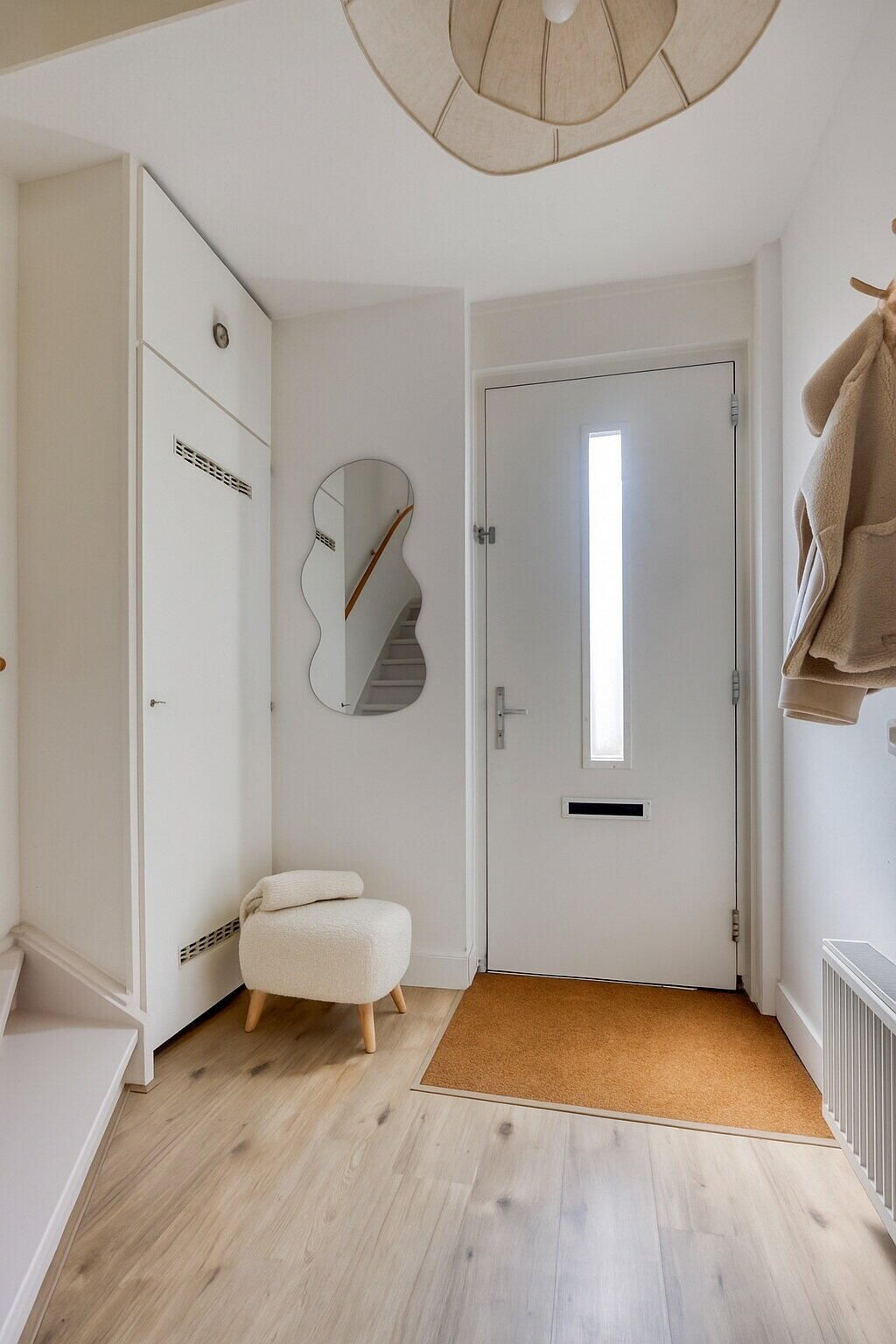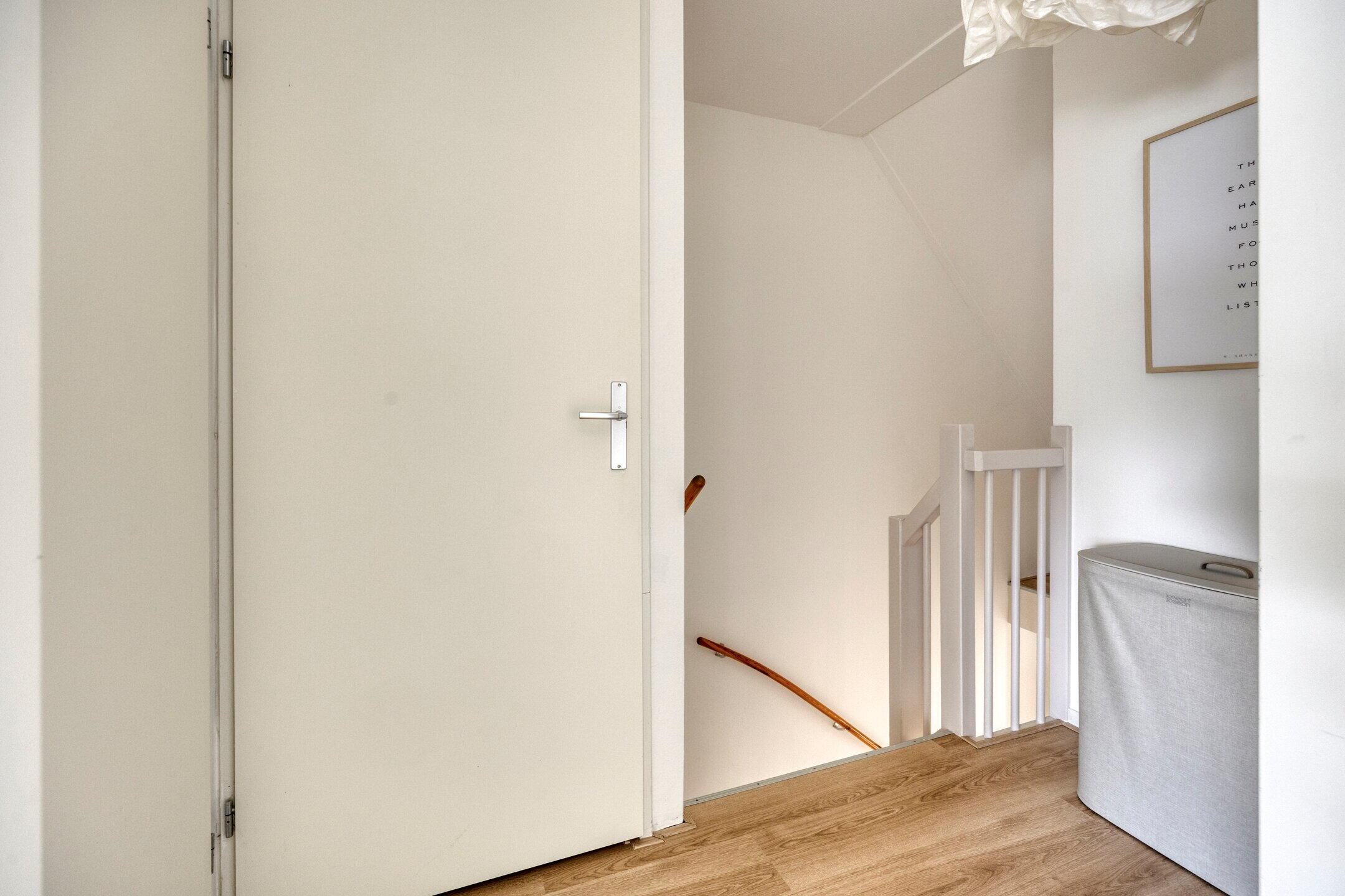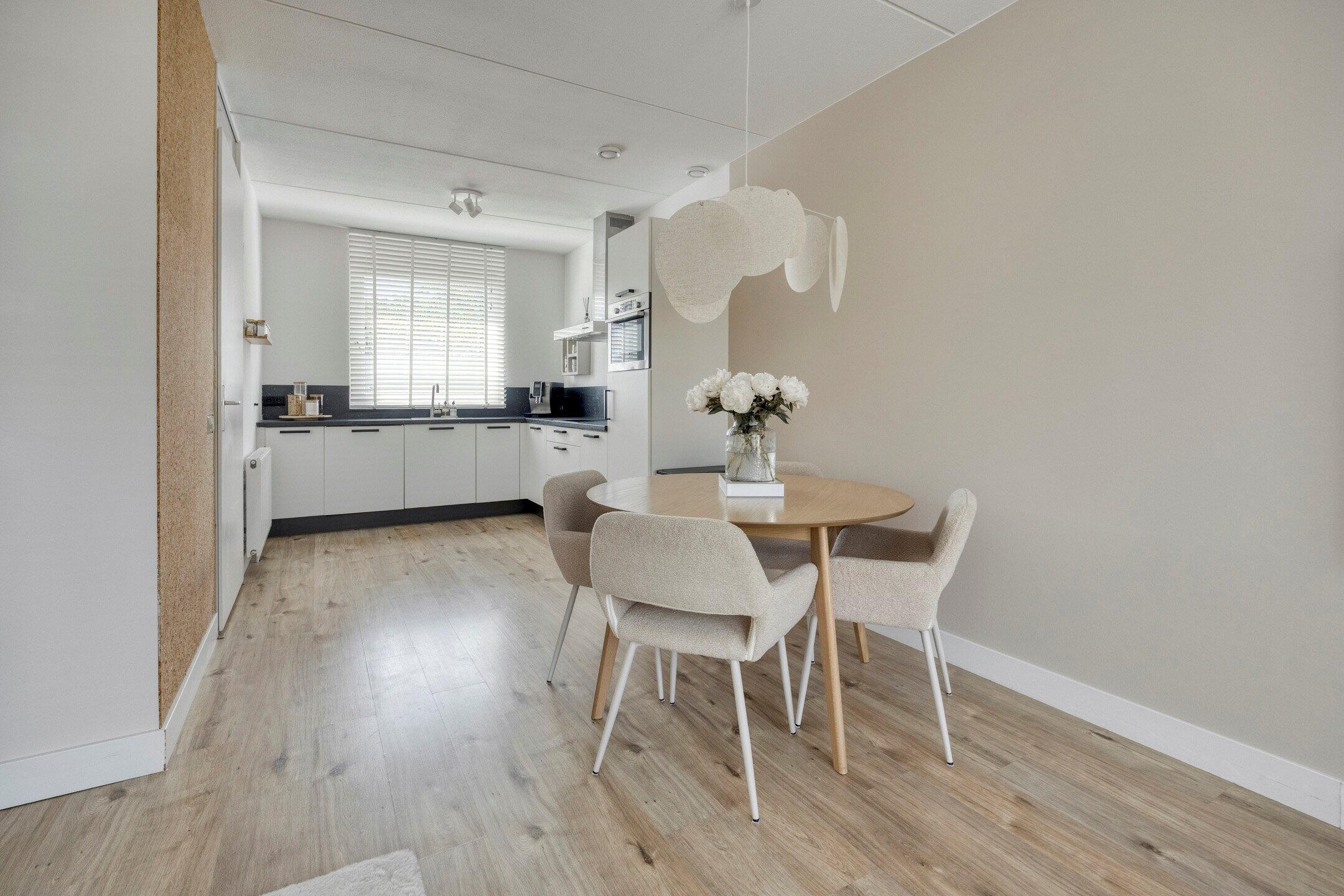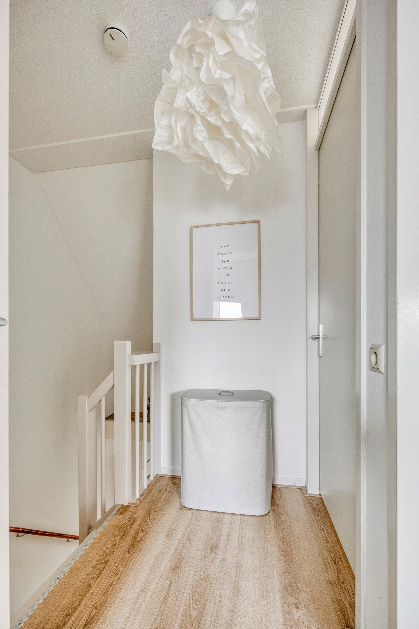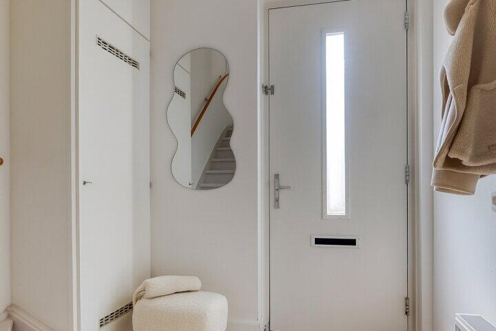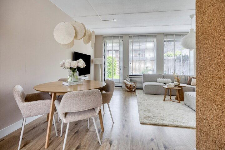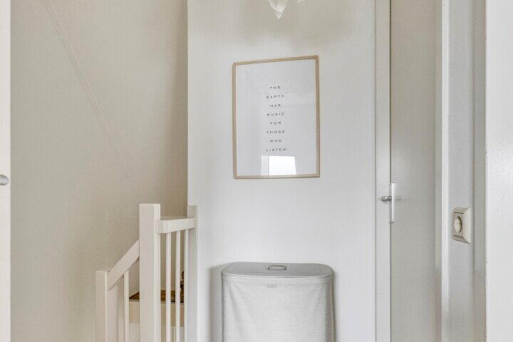 Wat direct opvalt in de gehele woning is de harmonieuze inrichting: de huidige bewoners hebben gekozen voor een rustige en natuurlijke stijl met wit- en aardetinten. Natuurlijke materialen als kurk en kokos versterken dit gevoel van eenheid en rust in huis.