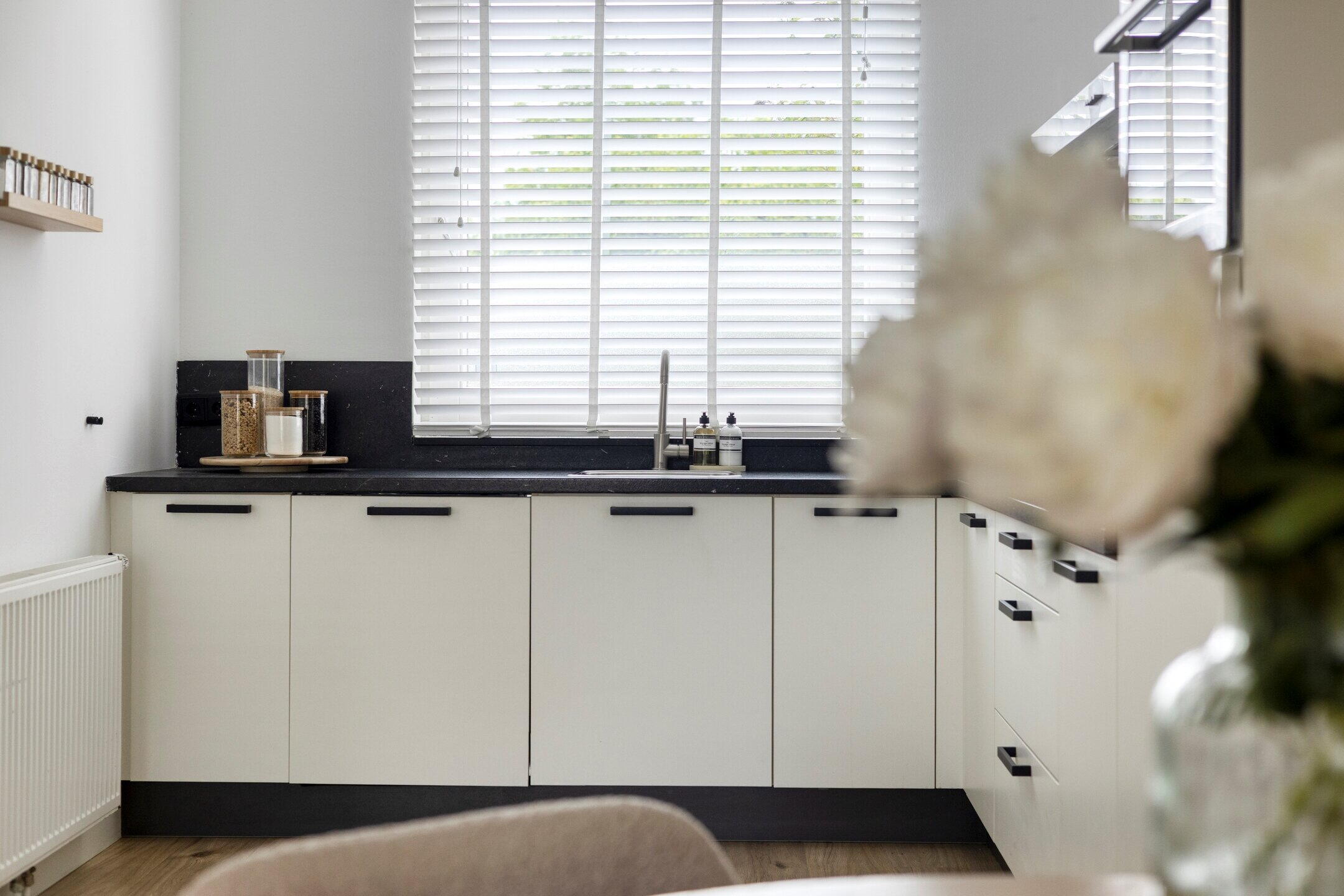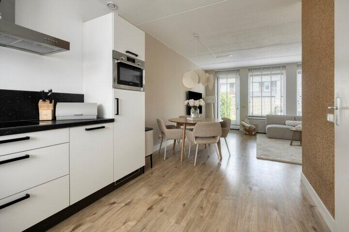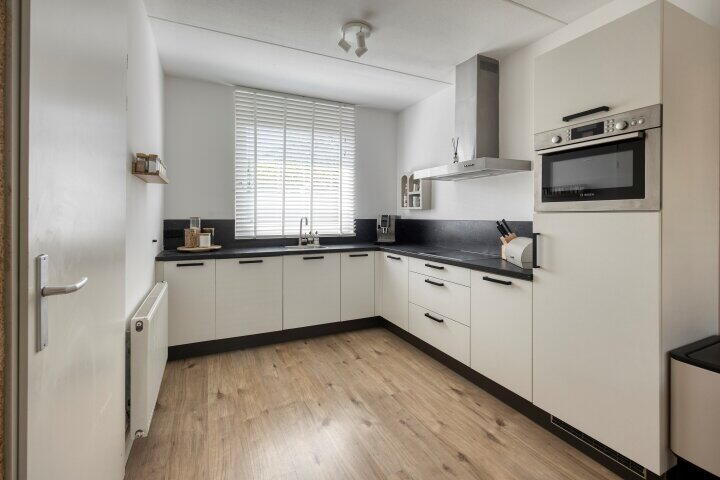 Via de groene voordeur betreedt u de ruime hal, waar zich de garderobe, het toilet en de trapopgang bevinden. Aan de linkerzijde loopt u door naar de lichte woonkamer met open keuken. Grote raampartijen zorgen hier voor een aangename hoeveelheid daglicht. De moderne keuken is voorzien van witte kasten en een zwart werkblad, wat zorgt voor een stijlvolle en tijdloze uitstraling. De keuken is uitgerust met diverse inbouwapparatuur, waaronder een inductiekookplaat, vaatwasser, koelkast en oven. In de woonkamer bevindt zich tevens een praktische voorraadkast.