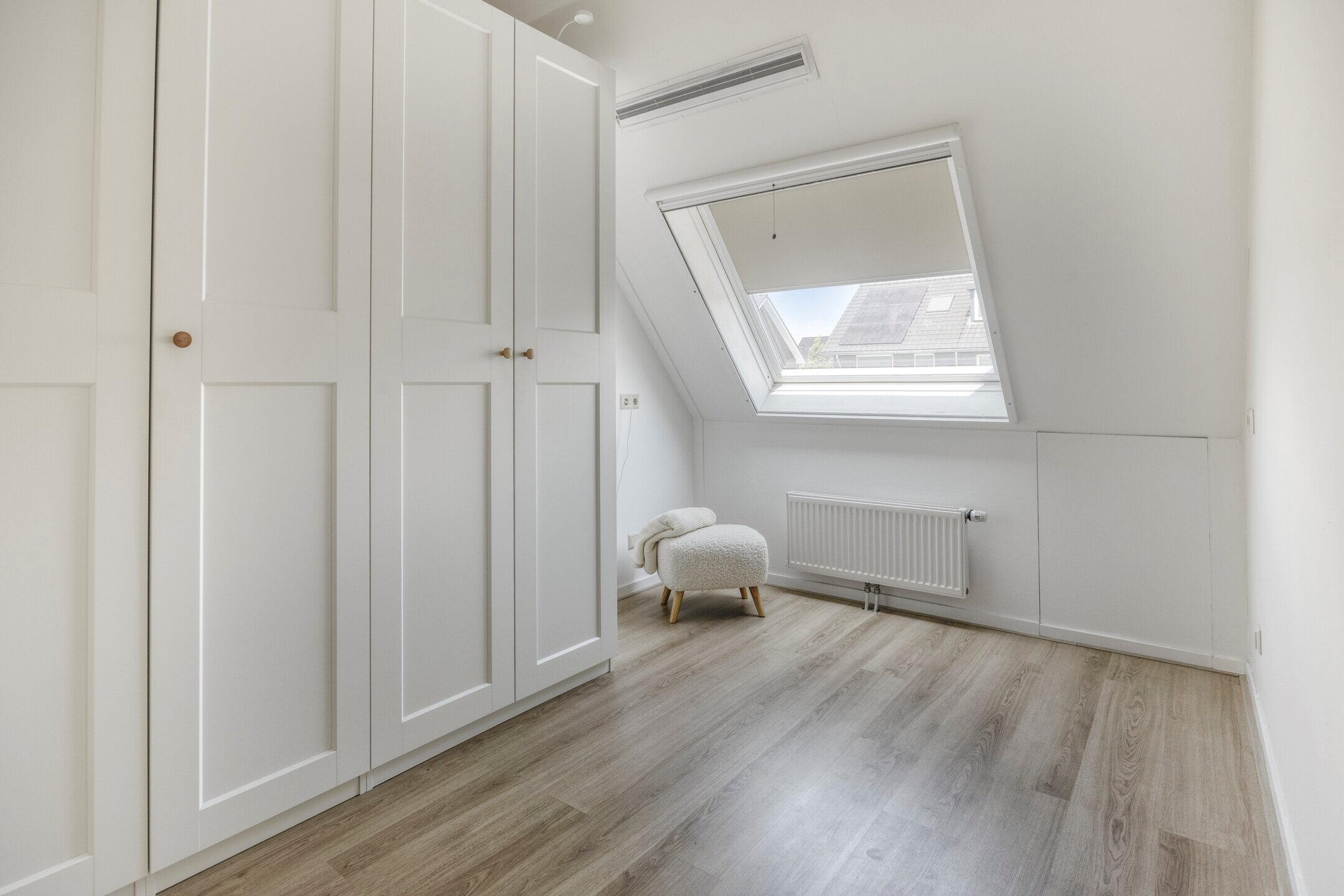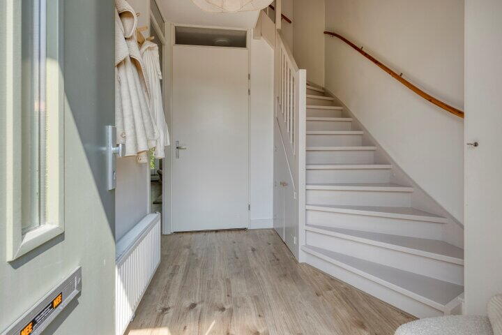 Via de trap bereikt u de eerste verdieping, waar zich o.a. de twee slaapkamers bevinden. De slaapkamer aan de voorzijde heeft een dakkappel wat zorgt voor extra ruimte en daglicht, de kamer aan de achterzijde en de badkamer zijn voorzien van een dakraam, wat zorgt voor prettig daglicht. Op de overloop bevindt zich een praktische kast met aansluitingen voor wasmachine en droger. Tevens treft u hier de badkamer aan, welke in 2024 volledig is gemoderniseerd. De badkamer beschikt over een tweede toilet, een glazen douchecabine en een stijlvol wastafelmeubel. Vanuit de overloop heeft u via een luik met vlizo trap toegang tot de verrassend ruime bergzolder, ideaal voor extra opslag.