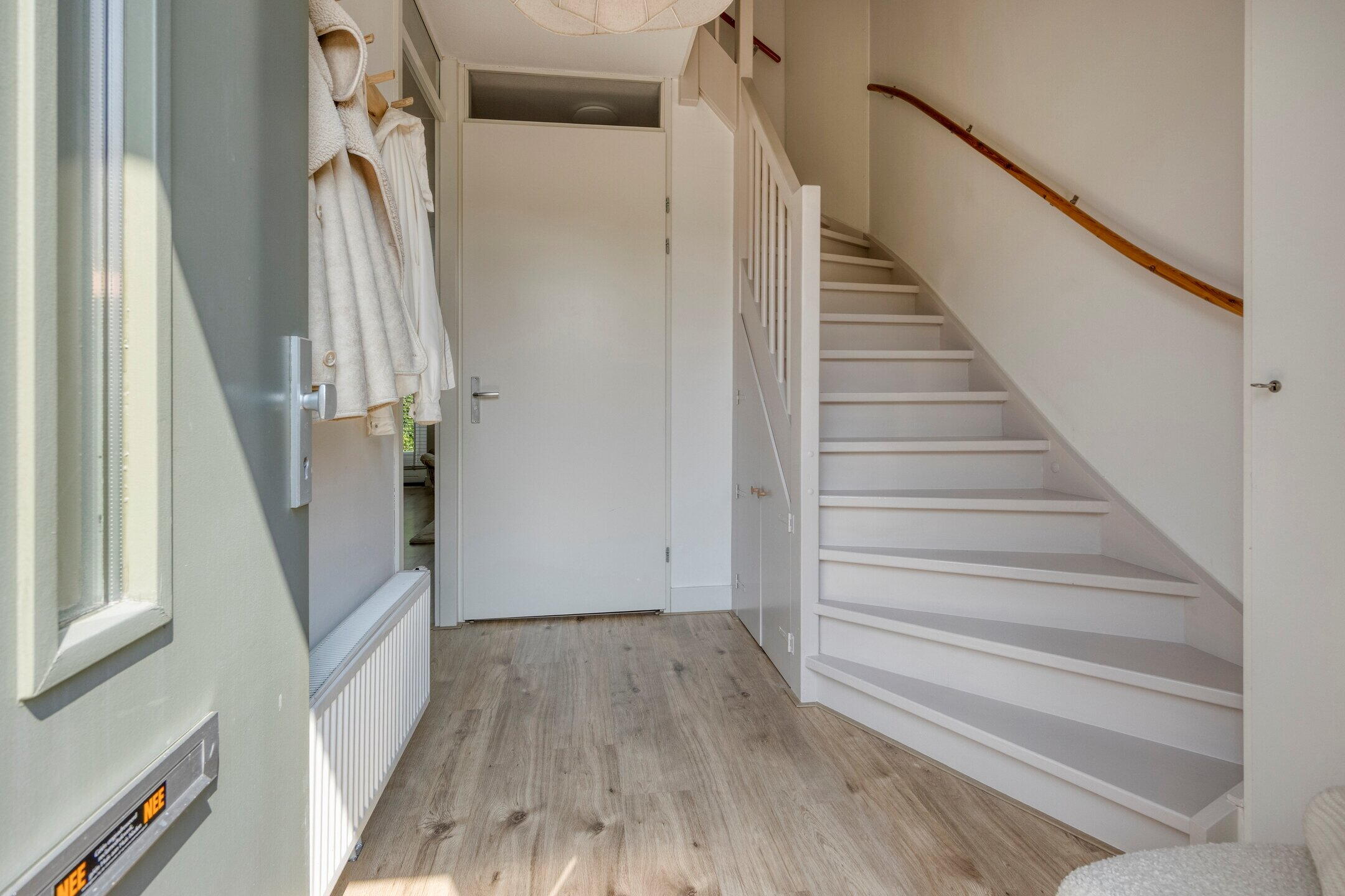 De woonkamer is opvallend licht en biedt volop mogelijkheden voor een eigen indeling. De grote raampartijen zorgen niet alleen voor veel daglicht, maar bieden ook een fraai uitzicht op de achtertuin, wat het gevoel van ruimte versterkt. De achterdeur biedt toegang tot de verzorgde tuin met ochtendzon – een fijne plek om in alle rust van een kop koffie te genieten.